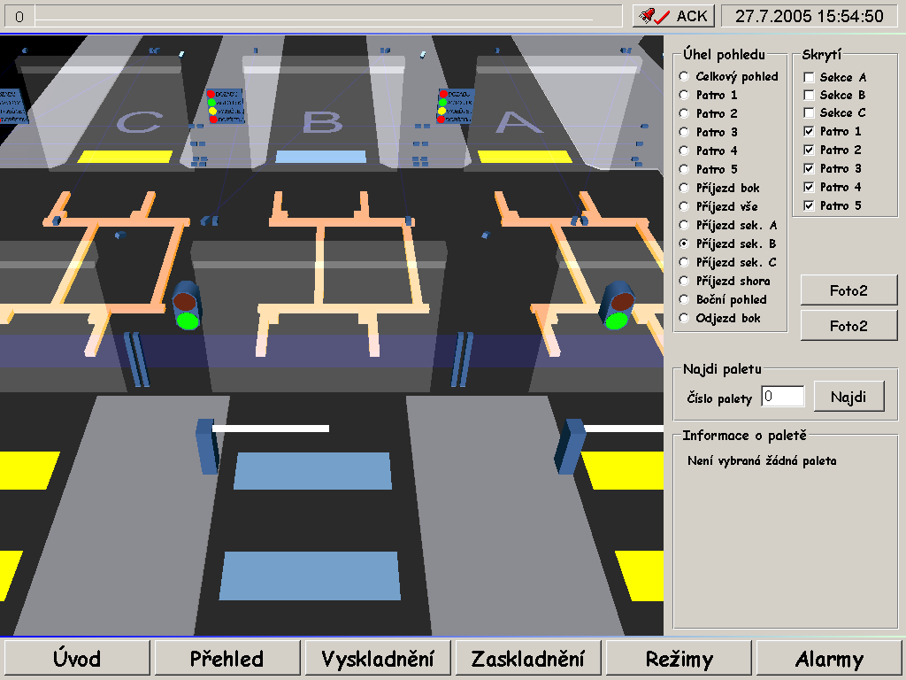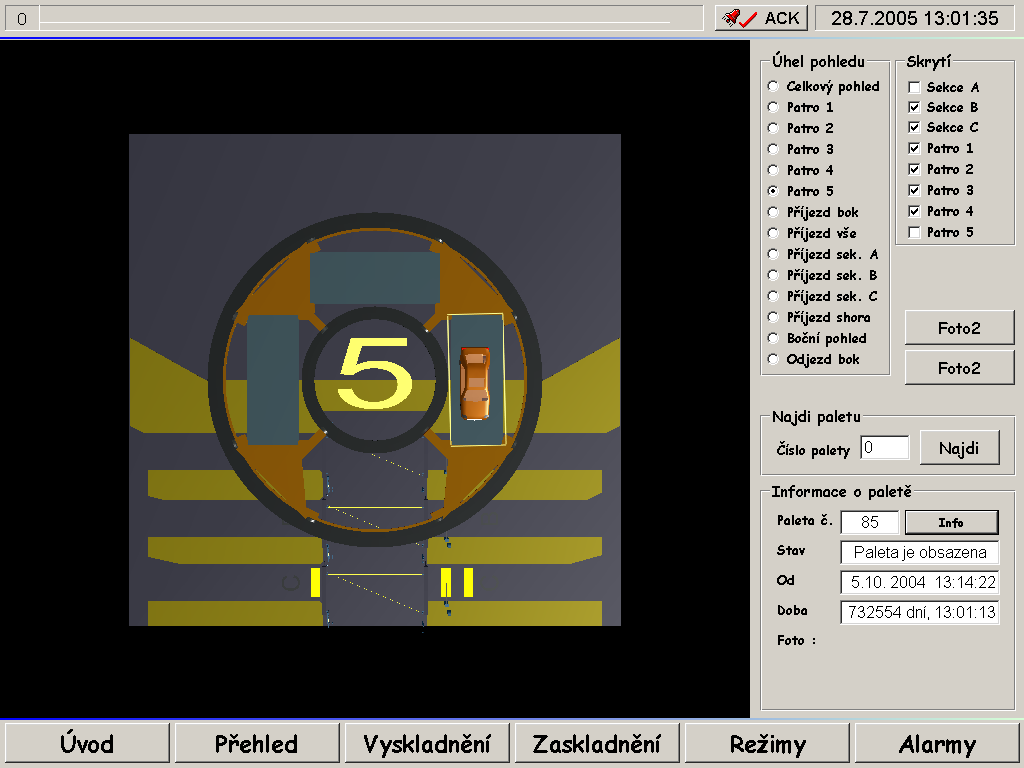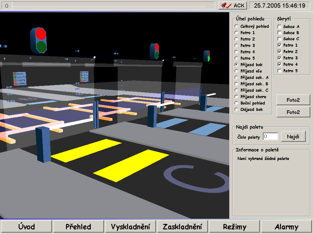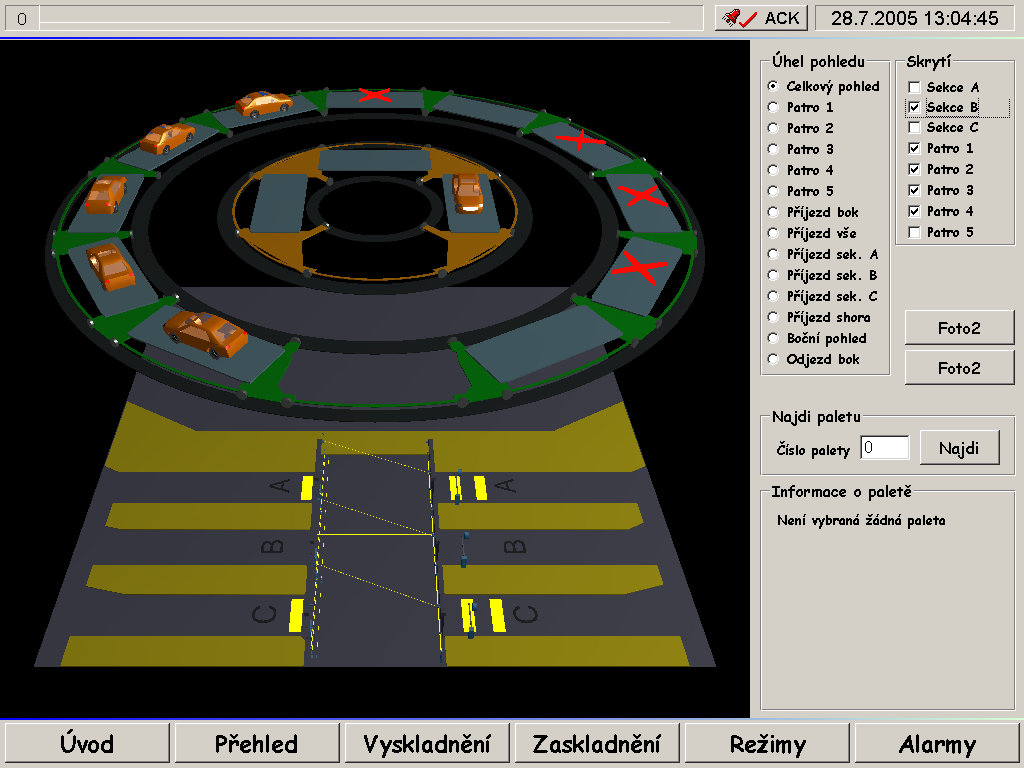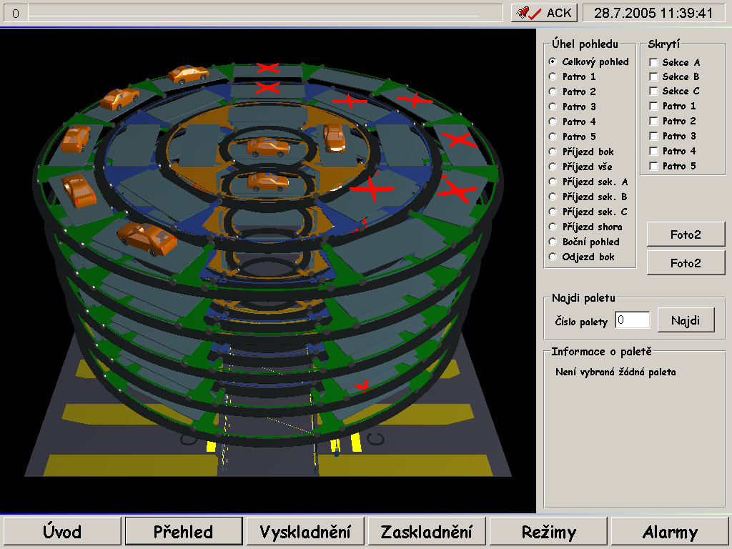 Na základní obrazovce je zobrazen 3D model parkovacího domu s možností nastavení různých pohledů a filtrů. Celý 3D model je animován a reaguje na skutečné stavy a polohy získané z PLC. Tato obrazovka slouží pro získání základního přehledu o stavu parkovacího domu, jednotlivých snímačů, zaplněnosti jednotlivých sekcí, pater a palet automobily. Je zde možnost zobrazit podrobné informace o každé paletě a automobilu, který je na paletě zaskladněn. Kteroukoliv prázdnou paletu lze označit příznakem „servisována“ a opět ji uvolnit do provozu. Obrazovka je navržena tak, aby se operátor vždy rychle zorientoval a měl přehled o tom, co se ve skutečnosti odehrává v technologii.