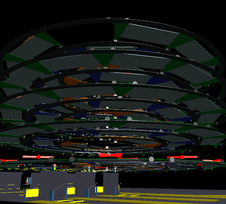 Pohled na prostorový model parkovací technologie zespodu od příjezdů