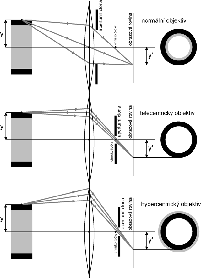 Princip projekce normálního, telecentrického a hypercentrického objektivu