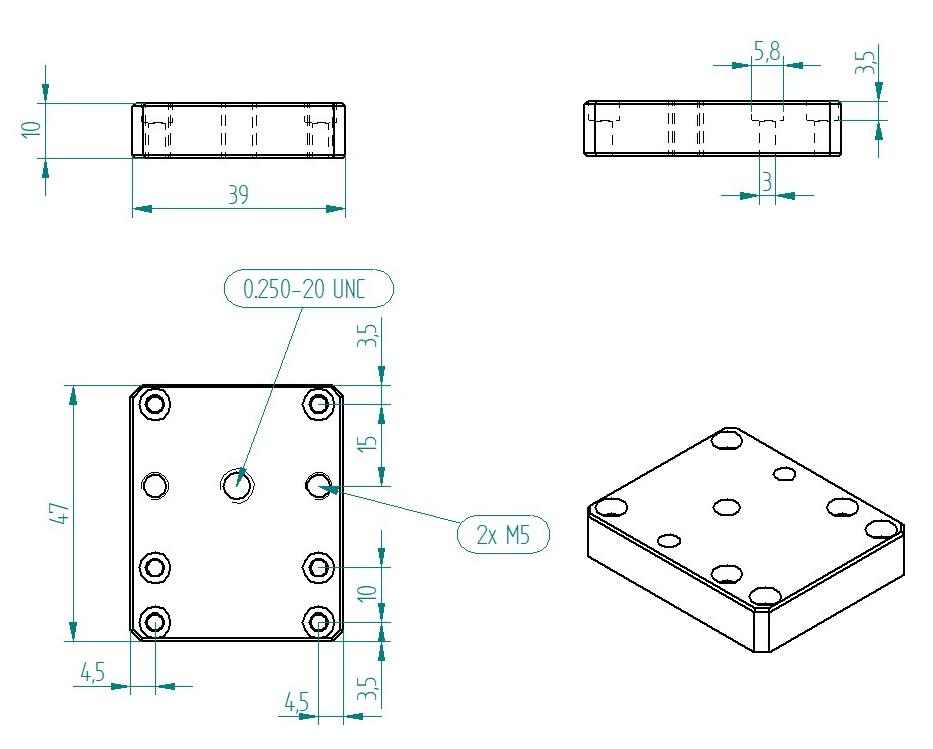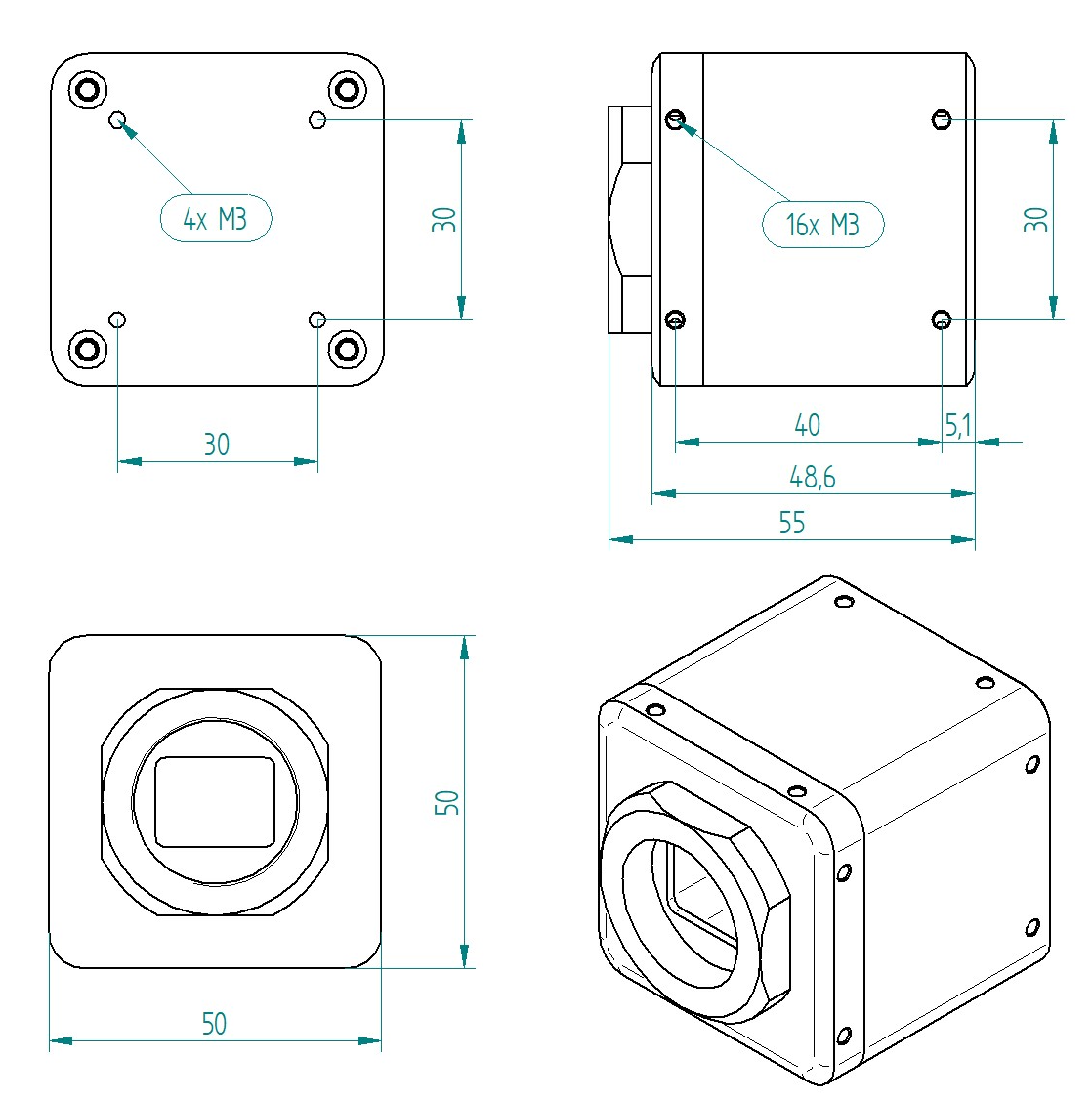 DataCam CMOS cameras feature mounting holes for easy attachment to various racks or brackets. These holes are located on the back wall and on the sides of the aluminum body. They consist of four M3 holes. Thread depth for attachment is 7 mm.