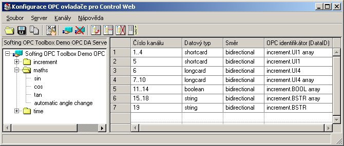 Je-li server úspěšně zaveden, objeví se v levém panelu struktura jeho jmenného prostoru. Z této struktury je možné přidávat jednotlivé položky do tabulky v pravé části aplikace pomocí dvoj-kliku nebo lze označit jednu či více položek najednou a přenést je do tabulky kanálů pomocí menu Kanály/Přidat vybrané položky. Smazání řádku z tabulky je možné po označení celého řádku kliknutím na políčko vlevo od řádku stiskem klávesy <Del>, případně pomocí nástroje Kanály/Smazat vybraný kanál. Také je možné smazat všechny řádky najednou pomocí menu Kanály/Smazat všechny kanály.