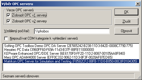 Toto okno zobrazí jména i CLSID všech OPC serverů instalovaných na lokálním nebo na vzdáleném počítači. Je možné omezit seznam zobrazených serverů podle verze. Řada serverů poskytuje rozhraní více verzí OPC.