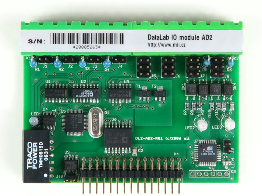 Modul AD2 má 4 diferenční analogové vstupy. Pomocí propojek lze