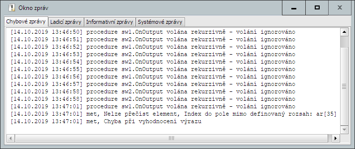 Chybové zprávy se shromažďují v samostatném okně.