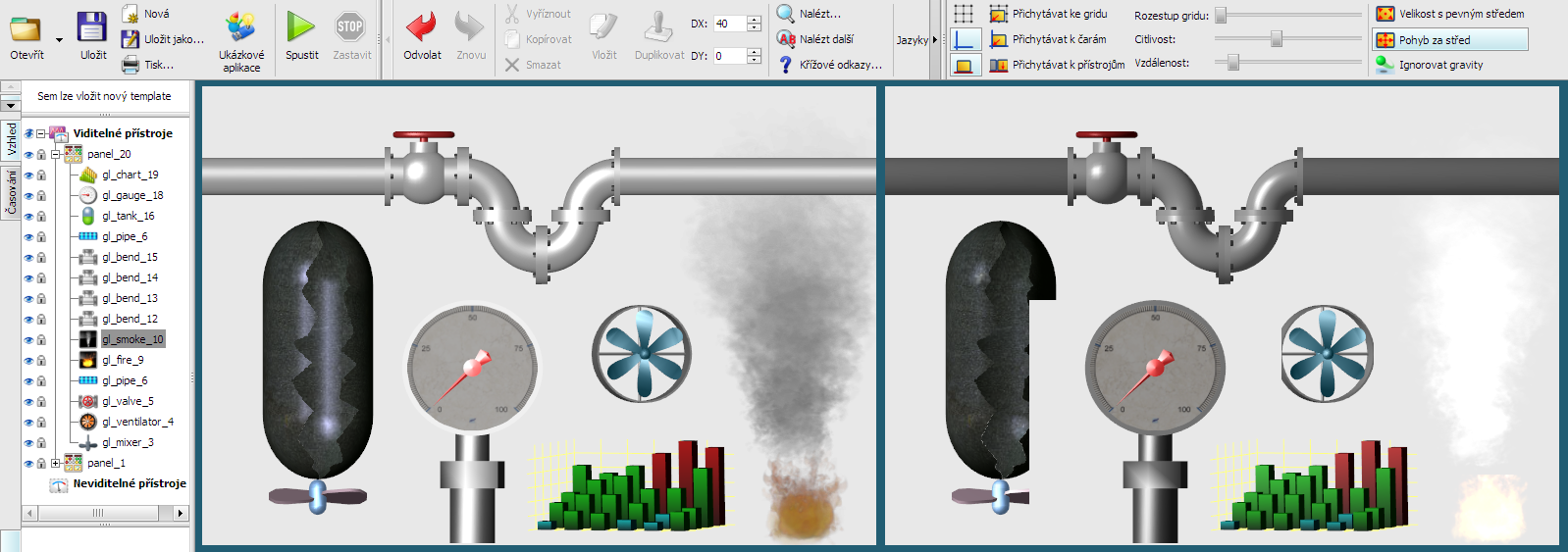 vlevo s OpenGL vykreslovačem, vpravo s vykreslovačem GDI