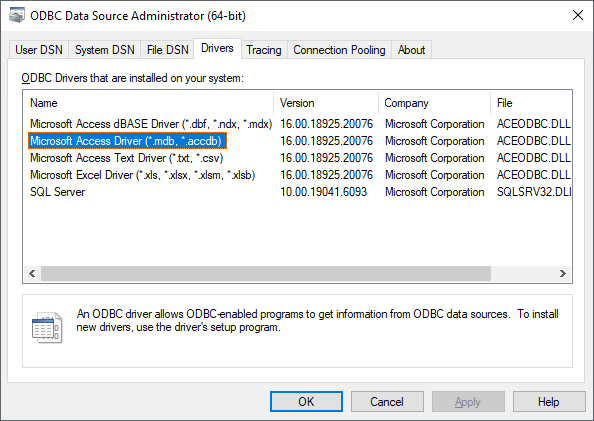 Access, pak prověřte, zda máte na počítači nainstalován potřebný ODBC