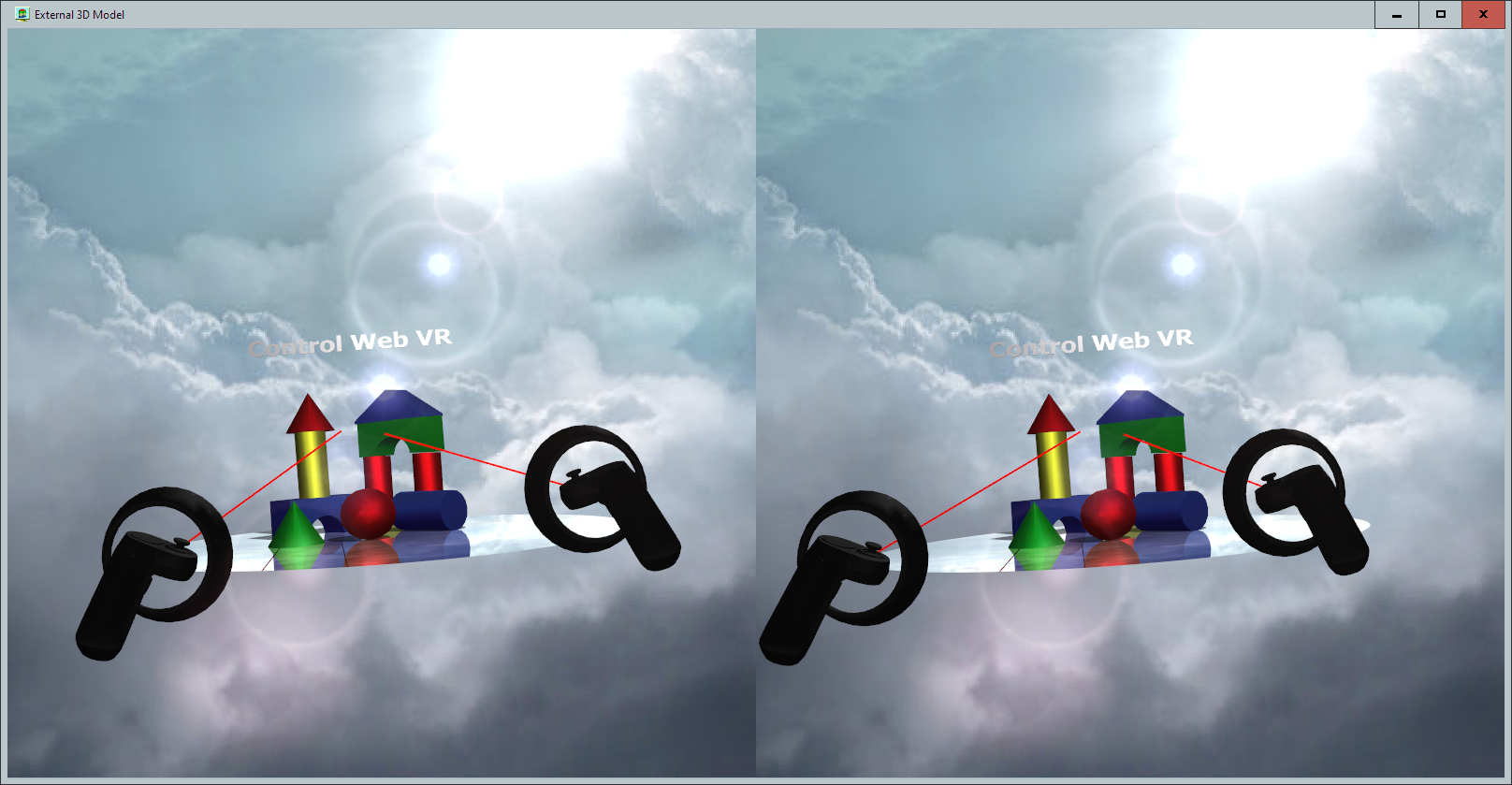• The Control Web software environment has been extended to include virtual instruments for virtual reality. In the implementation of virtual reality, we strived for the greatest openness and easy extensibility to support other standards. It is now possible to use Microsoft WMR (Windows Mixed Reality) standard headsets and controllers. The stereographic image is created by the virtual instrument gl_scene. It is therefore very easy to extend a range of current applications to include virtual reality environments. The finished image for the left and right displays in glasses is transferred to the WMR system. The wmr virtual instrument acts as the WMR client for the application program. This virtual instrument then runs its own Microsoft WMR portal in a separate process. The big advantage of this solution is that the huge and significant amount of system resources consuming portal is not part of the Control Web process memory and significantly less compromises the performance and stability of our application. So, if you don't use virtual reality in your app, none of its support is delaying or bothering you. In addition, there is the possibility of a gradual increase in the number of other virtual instruments for other standards of virtual reality. The Control Web scene not only generates a spatial image, but also acquires the current position and orientation in space. In addition, it also responds to commands from the controllers. Virtual instruments in the scene space can be operated normally using the controllers. Space can also be moved through the controllers.