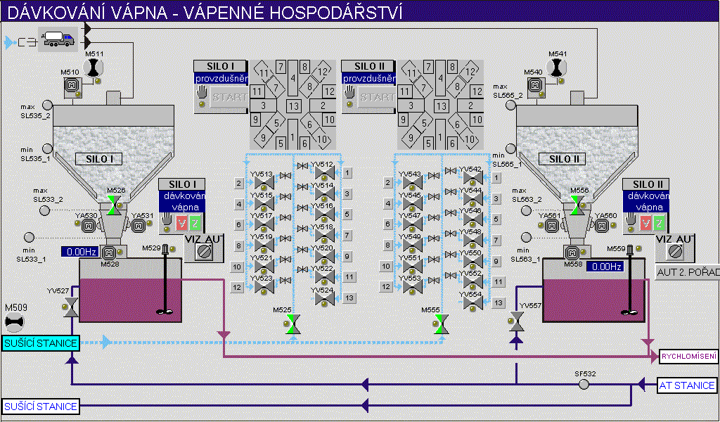 segmenty technologie. Vizualizace sleduje v cca 20 grafech stavy