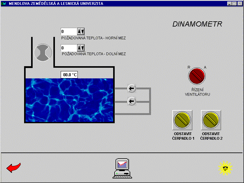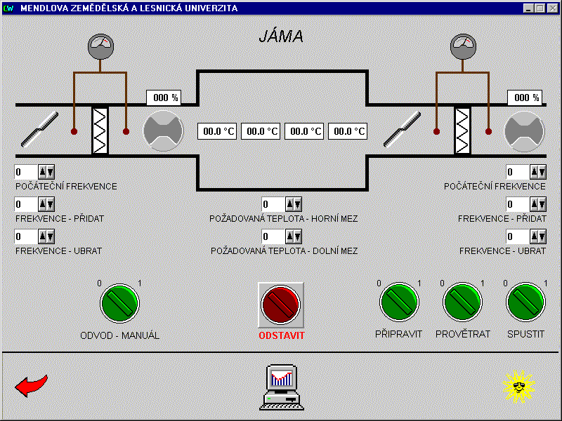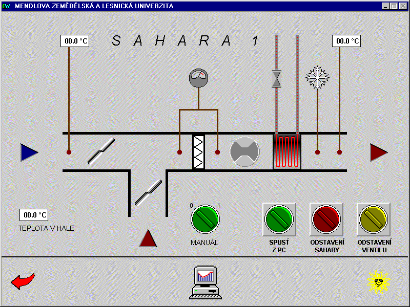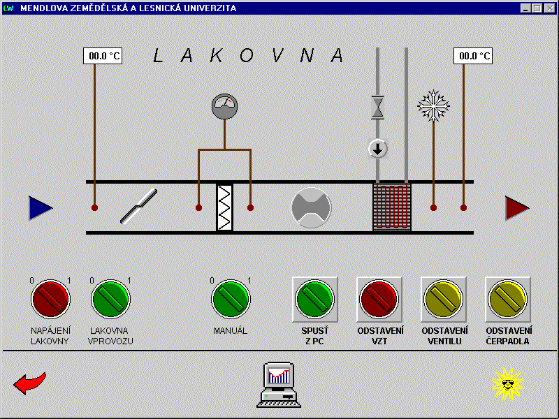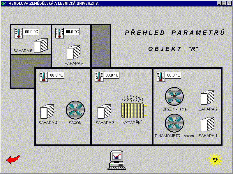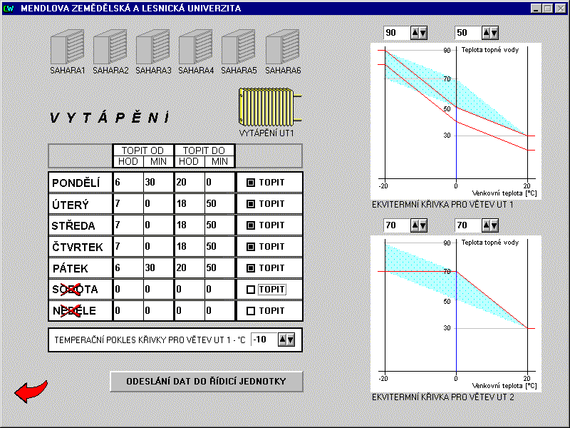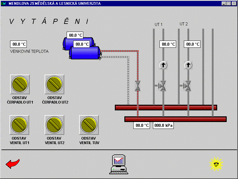 Systém řídí vytápění dvou objektů - kateder lesnické a zemědělské techniky. Kromě vytápění objektu katedra lesnické techniky navíc obsahuje řízení vzduchotechnické jednotky lakovny a katedra zemědělské techniky řízení vzduchotechnických jednotek výukových technologií brzd. U jednotlivých vzduchotechnických jednotek jsou motoricky ovládány vstupní a výstupní klapky a je hlídán tlak v systému před a za filtrem motoru, z důvodu možného zanesení filtru. Motory jsou spínány a u větších výkonů řízeny frekvenčními mněniči. Topné jednotky pro ohřev vzduchu jsou hlídány proti zamrznutí. Všechny vzduchotechnické jednotky pracují automaticky v závislosti na teplotách v místnostech a nastaveném algoritmu pro ohřev a výměnu vzduchu. V každém řídicím uzlu je instalován průmyslový automat Mitsubishi Melsec, propojený sériovou komunikační linkou s operátorským počítačem v objektu katedry zemědělské techniky a druhým operátorským pracovištěm umístěným u energetika. Operátorské pracoviště katedry zemědělské techniky a energetika mají stejnou prioritu pro nastavování parametrů vytápění řízených objektů. Řízení vzduchotechnických technologií umožňuje pouze pracoviště katedry zemědělské techniky. Pracoviště energetika podává informace o stavu těchto technologií, bez možnosti vnějšího zásahu do jejich ovládání. Vizualizace a řízení u obou operátorských pracovišť je řešena v prostředí systému Control Web.