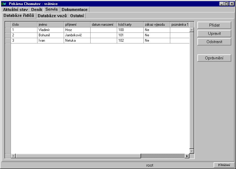 Servisní obrazovka - uživatelská databáze