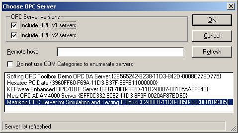 This dialog shows names and corresponding CLSIDs of all OPC servers installed on local or remote computer. It is possible to restrict the displayed OPC servers to version 1 or version 2 only. Many servers provide all interfaces of both versions so they will be displayed in both cases. The OPC driver configuration tool searches OPC servers according to COM Component Categories, which is the standard COM component identification mechanism. The OPC Foundation defined two globally unique identifiers (GUIDs) for OPC DA Server v1 and v2 categories. It is necessary to register particular category and to assign appropriate category GUID to installed server during installation process. But there are servers, whose installation programs ignore this rule. This is why there is the check box Do not use COM Categories to enumerate servers in the dialog box. If the box is checked, the presence of the OPC key in the Registry is used for distinguishing OPC servers instead of COM categories. The list of found servers then can contain components, which are not OPC servers and an attempt to connect to such component will lead to error message. On the other side, such option enables to work even with wrongly installed server.