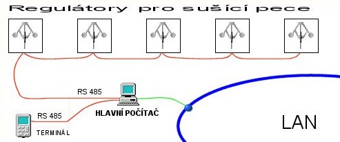 • Po další sběrnici RS485 probíhá komunikace s terminálem TERM01, kterým obsluha pecí vkládá požadavek na číslo pece a výběr várky. Dvě sběrnice byly použity vzhledem k použití rozdílných komunikačních protokolů (ASCII, Profi BUS).
