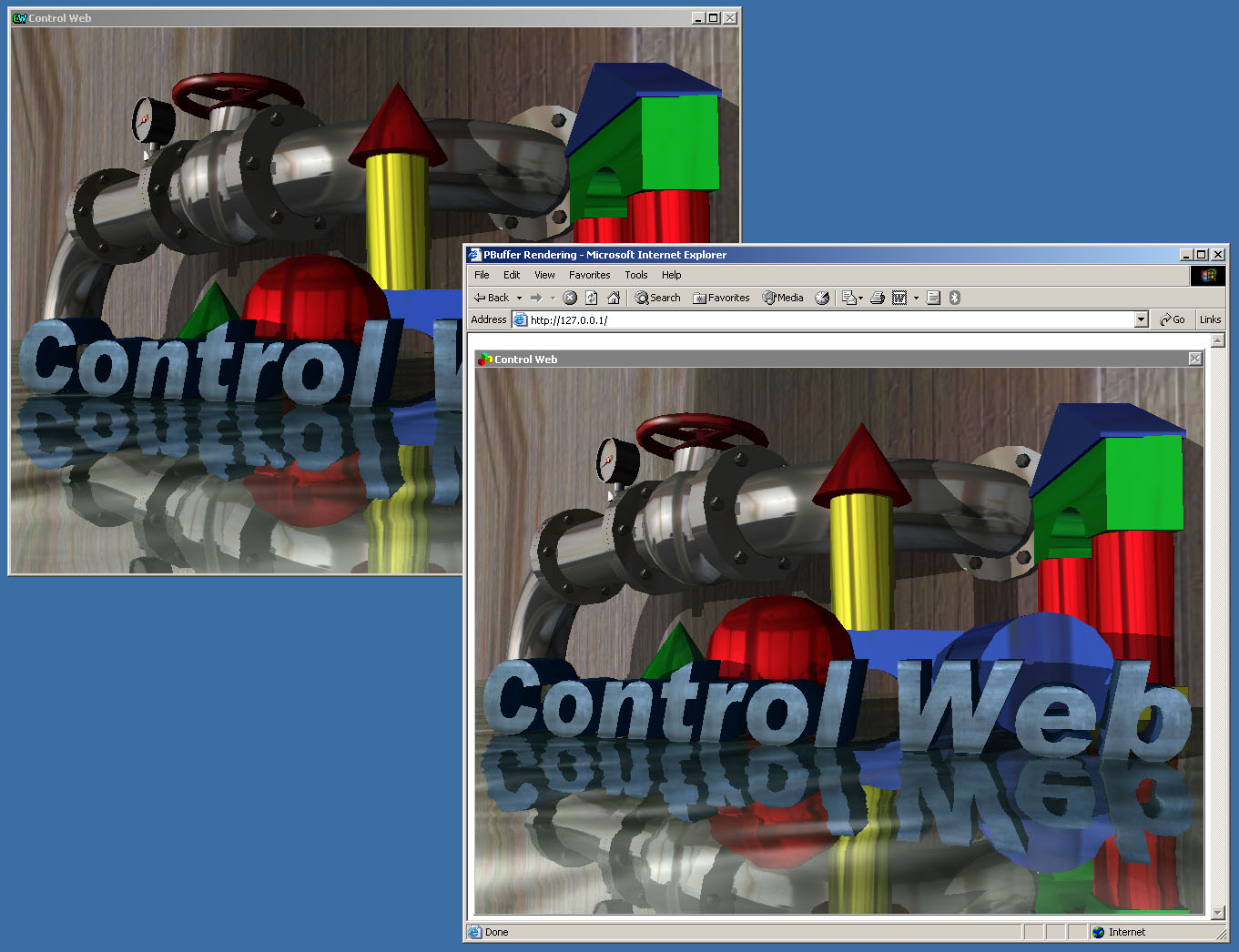 Na první pohled zcela samozřejmý požadavek viditelnosti 3D scény v internetovém klientu ve stejné kvalitě jako na obrazovce s kvalitním 3D akcelerátorem přináší několik nečekaných úskalí. Nejlépe použitelnou metodou systému Control Web verze 5 bylo kopírování obrazu z bufferů existujícího obrazovkového kontextu, ale i ta občas přinášela několik obtíží. Ta největší spočívala v tom, že vinou podivné "optimalizace" řady grafických ovladačů nebyly buffery v částech odpovídajících oblastem na obrazovce překrytým jinými okny správně inicializovány. Vykreslování sice i v těchto částech probíhalo normálně, ale výsledný obraz zde byl samozřejmě zmatený. Další problém spočívá v nutnosti vykreslit obraz na základě požadavku např. HTTP serveru. Vykreslování pak probíhalo mimo prováděcí tok renderovacího serveru a to se neobešlo bez synchronizací značně narušujících plynulost animací.